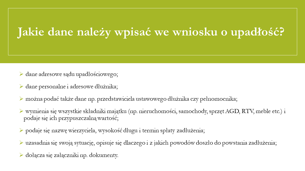 Na początku trzeba przygotować wszystkie dokumenty, z których wynika zadłużenie. Przygotować listę własnych wydatków, opisać jakie ma się w domu składniki majątku i określić ich wartość (np. samochód, tv, meble etc.). Sporządzić wniosek o ogłoszenie upadłości.