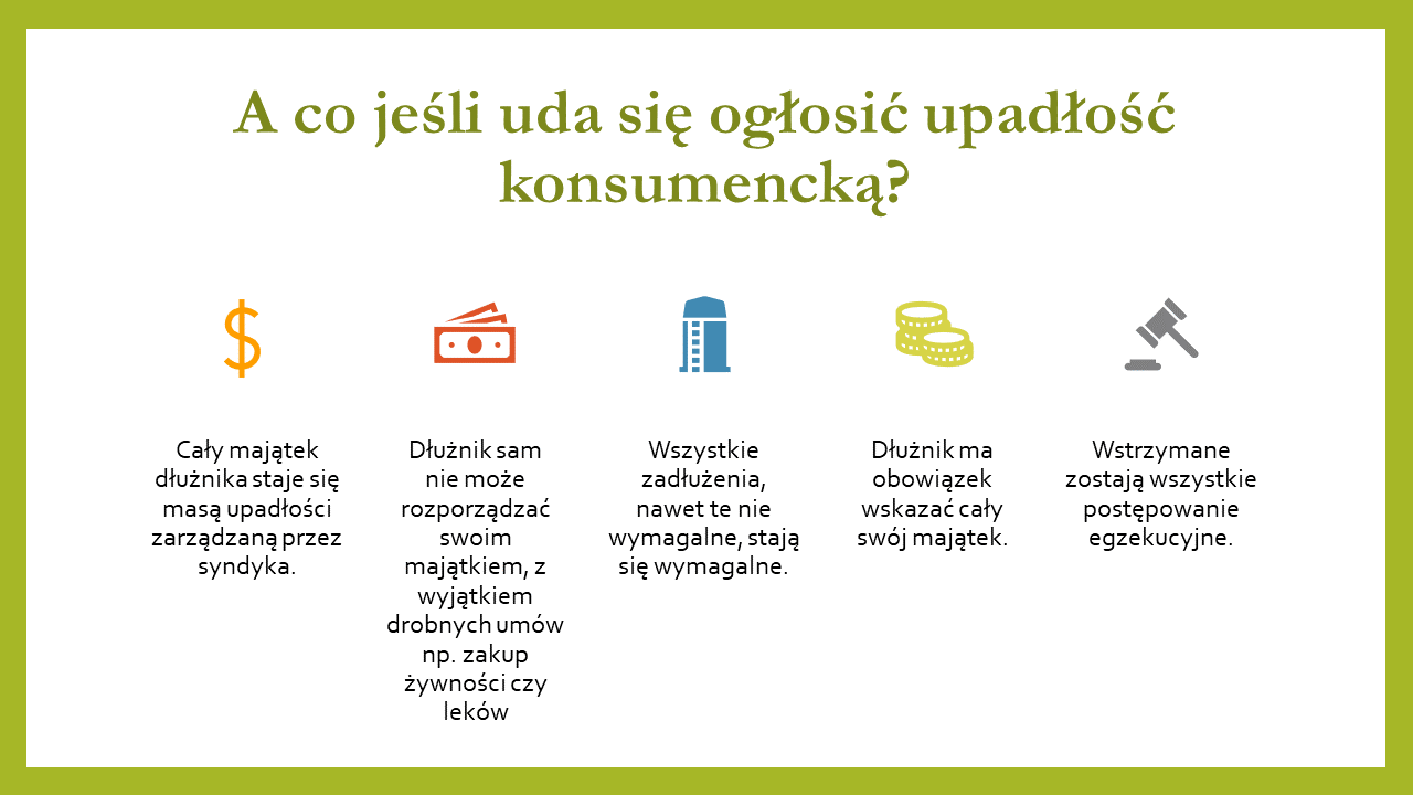 Jeśli zatem posiadasz kilka, różnorodnych czy nawet jednorodnych zadłużeń, straciłeś pracę np. na skutek zachorowania, czy innych przyczyn od Ciebie niezależnych, nie stać się na utrzymanie domu a co dopiero na spłacenie długu, to zawsze możesz skorzystać z możliwości upadłości konsumenckiej.